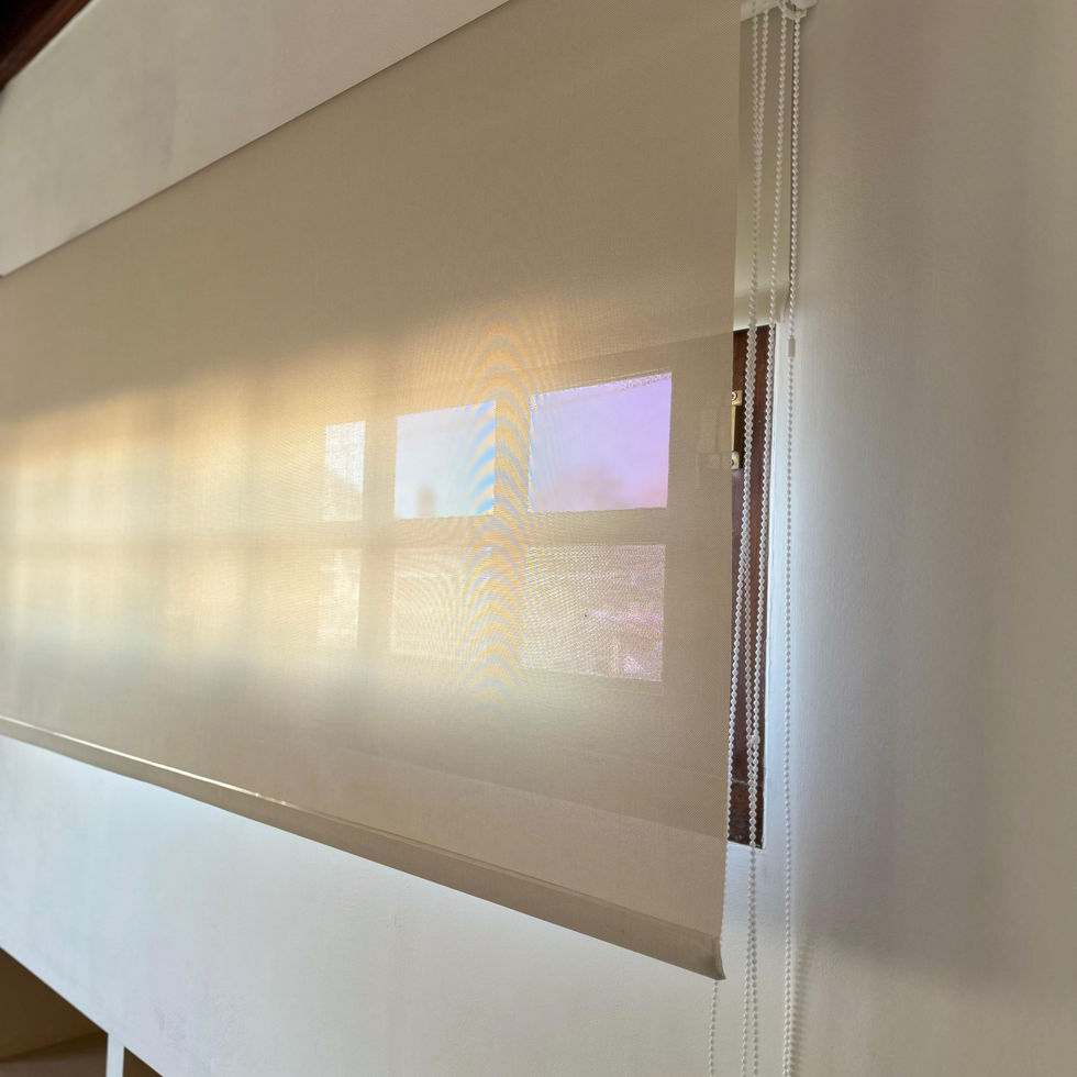 Las cortinas roller de sistema doble combinan en una misma ventana dos tipos de telas: una sunscreen que filtra la luz natural y permite visibilidad hacia el exterior durante el día, y otra blackout que bloquea completamente la entrada de luz, brindando privacidad y oscuridad total cuando lo necesitás.